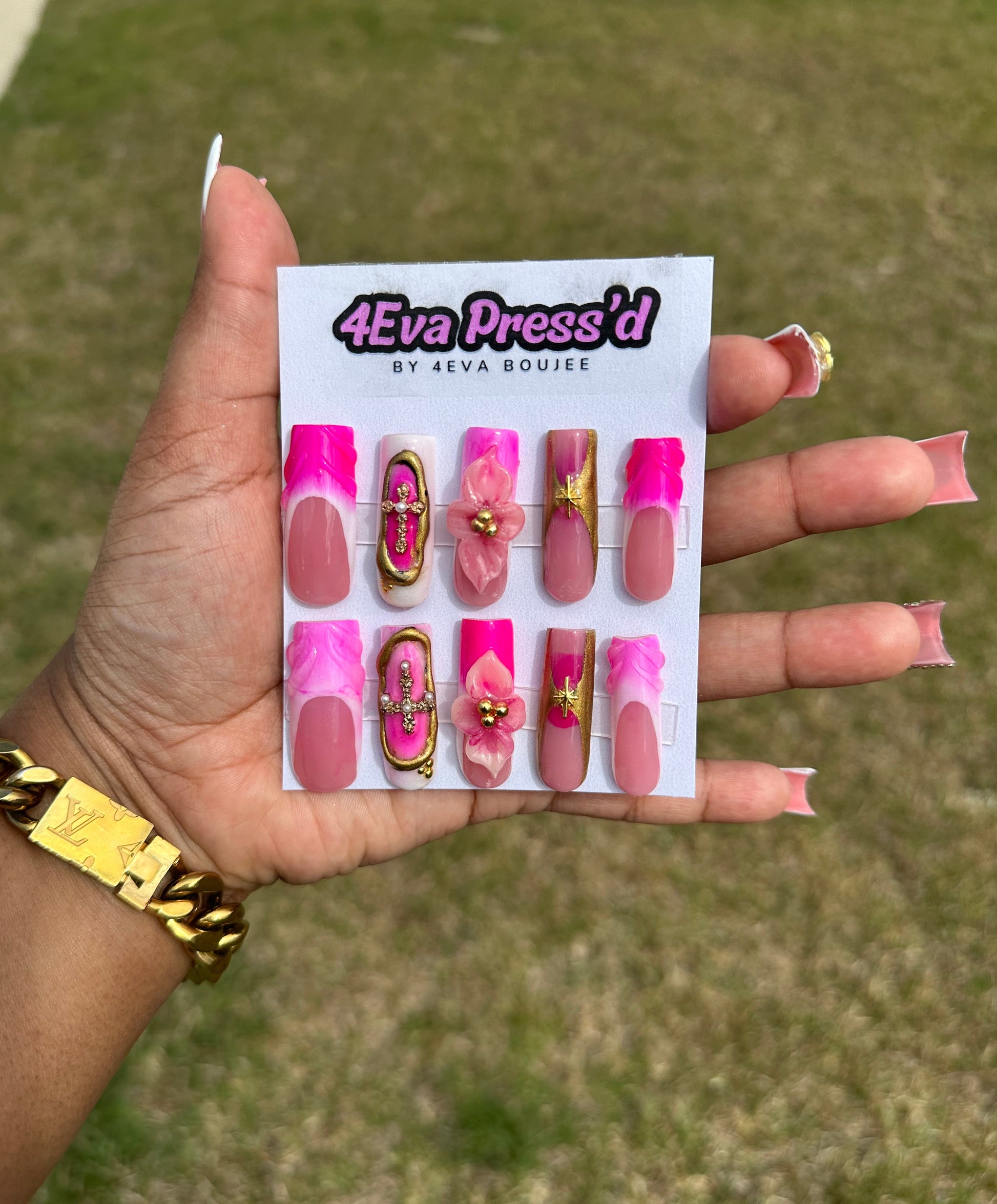 “Blessed & Boujee” features vibrant pink tones, gold detailing, and elevated 3D accents that bring this set to life. With a mix of florals, crosses, and high-shine finishes, this set is giving glam, rich, and divinely pretty all at once. 💎